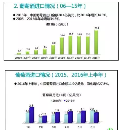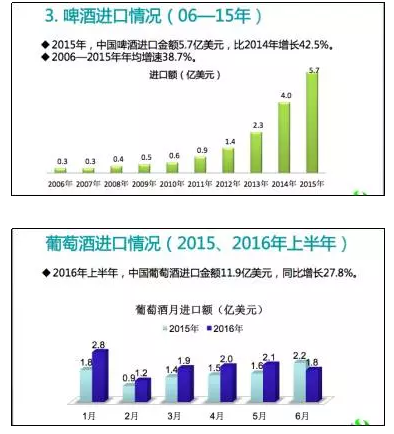 王旭偉透露,2016年上半年,葡萄酒進口金額為11.9億美金,同比增長27.8%。上半年,啤酒進口金額為3.2億美金,同比增長33.4%。