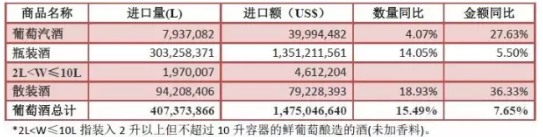 葡萄酒進口繼續小幅上行。其中,瓶裝酒量額雙增,增幅較小,散裝酒量額增長較明顯,葡萄汽酒數量小幅攀升,金額增幅較大。瓶裝酒進口額13.5億美元,同比增長5.5%,占葡萄酒進口總額91.2%。