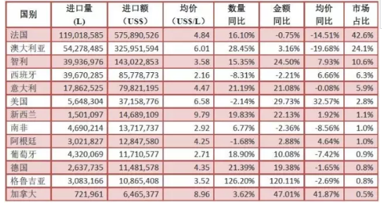 同期,進口瓶裝酒市場仍維持著法國、澳大利亞、智利三分天下的格局,三者市場份額合計77.3%,其中法國基本持平,澳大利亞微幅增長,智利增幅較大;另一方面,其他瓶裝酒進口來源地總體向好的基本面未變,其中,格魯吉亞得益于中格自貿協定的簽署延續著量額猛增的態勢。