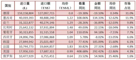 1-7月,進口啤酒市場中,德國依舊無人出其右,墨西哥與荷蘭則在伯仲之間,其中,德國與荷蘭量額均有不小跌幅,墨西哥維持強勢增長。其他進口來源地方面,葡萄牙之前的驚人增速略有回落,而英國高增長的態勢仍在繼續。