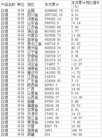 2015年1-9月生產白酒9386656.78 千升,同比增長5.53 %。