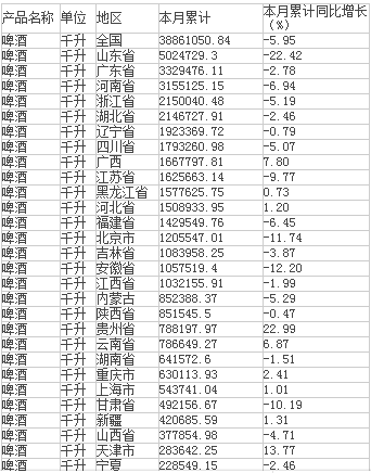 2015年1-9月生產啤酒38861050.84 千升,同比下降5.95 %。
