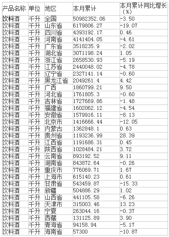 2015年1-9月生產飲料酒50982352.06 千升,同比下降3.50 %。