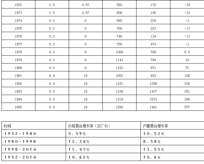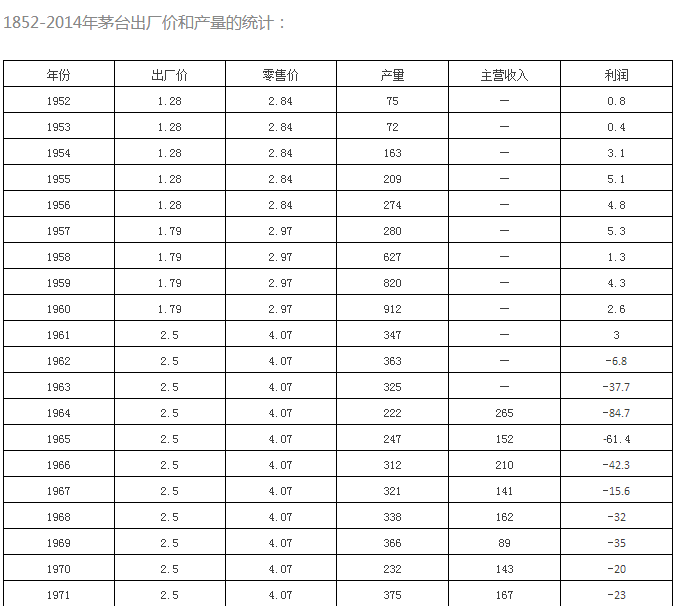 在參加茅臺獲巴拿馬萬國金獎一百周年的慶典活動中,貴州茅臺向參會人員贈送了一批重要的,中國酒文化以及茅臺發展歷程的資料,這些資料合計重量有十斤左右。活動結束后我對這些資料認真的進行了閱讀。發現資料中關于茅臺從1951年到2014年產量價格都有紀錄,1862年到1949年的產量價格也有文字介紹。以資料中提供的數據為基礎,我把從1952年到2014年間貴州茅臺酒的產銷和價格變動情況進 行了數據統計。