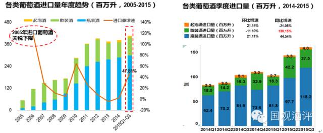 2015年以來,中國進口葡萄酒增長速度勢如破竹,前三季度進口量同比分別增長23.8%,62.8%,54.8%,三個季度累計進口量超過2014年全年進口量,同比增長超過40%,同時,歷史數據顯示每年的4季度都是旺季,是全年進口量最高的季度,因此2015年全年的進口量增長超過40%基本板上釘釘。