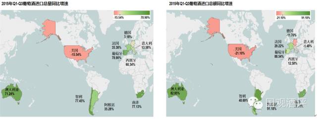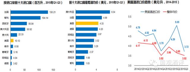 2015年中國進口酒市場如火如荼,前三季度累計進口量已超去年全年,同比增幅超過40%,但美國似乎沒有從今年進口葡萄酒的高增長中受益,反而成為中國十大葡萄酒進口來源國中唯一一個前三季度葡萄酒對中國出口總量和總額都呈負增長的國家,而且均價也出現下跌。通過數據比對和研究,國觀智庫發現這背后主要有三點原因: