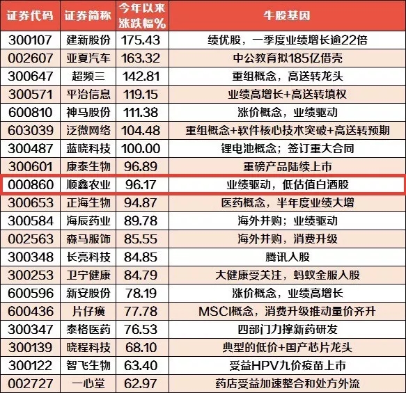 首先是排名第9的順鑫農業,今年以來漲幅達到96.17%,成為今年白酒漲幅第一股。