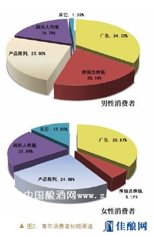 由圖1來看,男青年對黃酒的認識明顯要比女青年清晰,而女青年竟有一半認為黃酒就是料酒,顯然他們對黃酒的認識明顯不夠。原因一方面可能是黃酒的宣傳策略、方式、渠道以及廣告的表達與女青年消費者的信息接收方式對接不上。有數據表示,廣告對男女青年的影響幾乎相當,而且廣告宣傳也占了黃酒宣傳渠道中較大的比例,但達到的效果并不顯著,甚至有相當一部分的青年男女是通過產品陳列自己了解的,這說明黃酒整個行業的廣告宣傳力度不夠。另一方面可能是黃酒企業長期重視男性顧客而忽視女性顧客,導致女性對黃酒的認知程度遠低于男性。