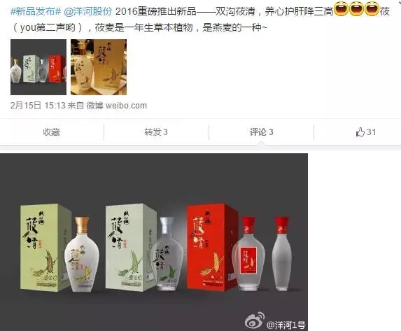 據洋河1號官微回復,莜清產品的宣傳語為“雙溝莜清有三寶,養心護肝降三高”,且將成為公司2016年的主推產品。