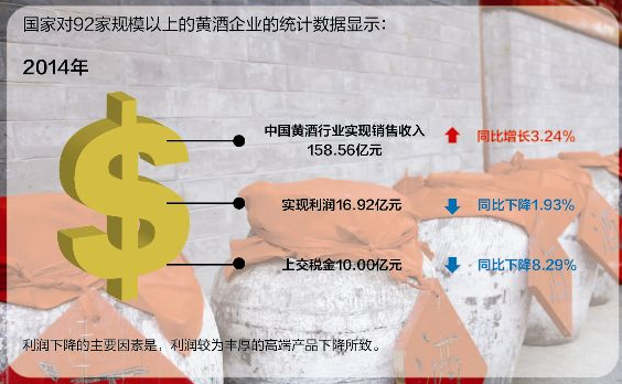 國家對92家規模以上的黃酒企業的統計數據顯示,2014年中國黃酒行業實現銷售收入158.56億元,同比增長3.24%;實現利潤16.92億元,同比下降1.93%;上交稅金10.00億元,同比下降8.29%。利潤下降的主要因素是,利潤較為豐厚的高端產品下降所致。