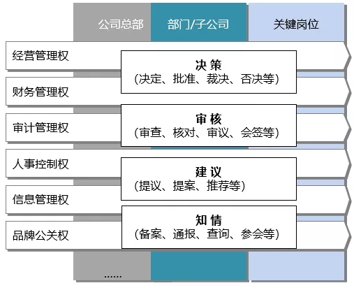 集團總部和下屬企業在戰略管理、投資管理、融資管理、經營管理、財務管理、人力資源管理、審計監察管理、IT管理等主要職權上要做到權責劃分清晰、授權合理,同權同責,明確權限配置,提高決策運營效率。